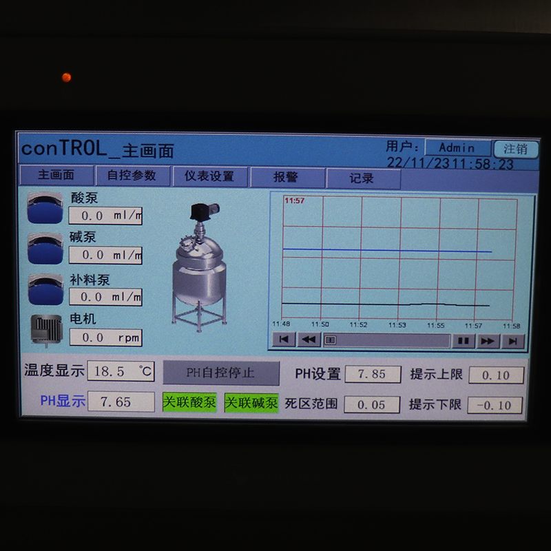 | 自动加料控制系统 | 在线PH自动控制系统触摸屏控制三台蠕动泵的进料速度,根据设置的PH值自动补料,数据导出有USB接口,导出格式EXCEL | ||||