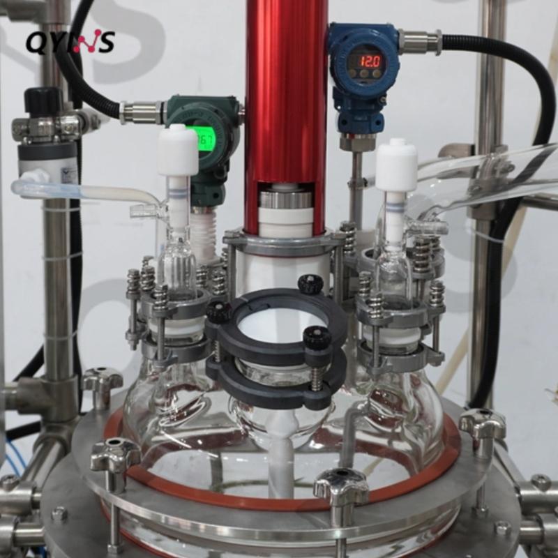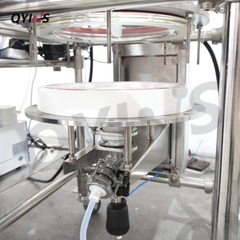 一体成型式四氟搅拌桨、棒与桨之间无缝隙、无残留、无交叉污染,双层高硼硅玻璃釜体,夹套通介质,放料为三通阀。