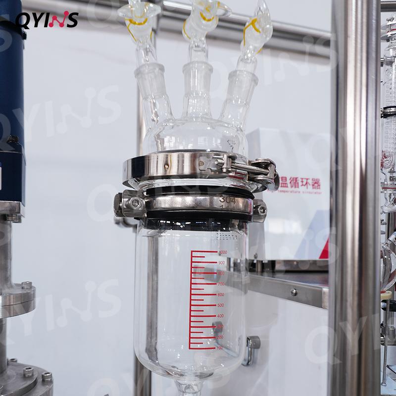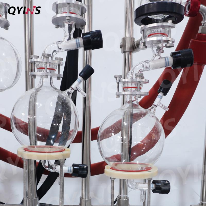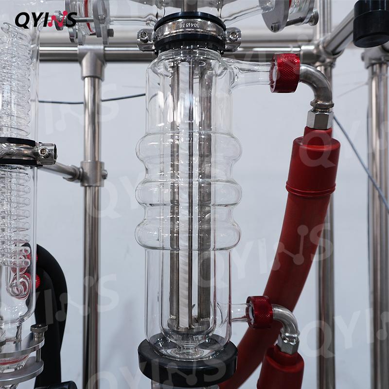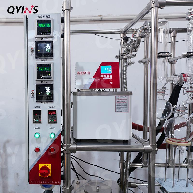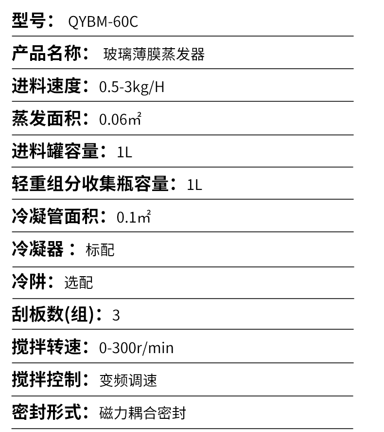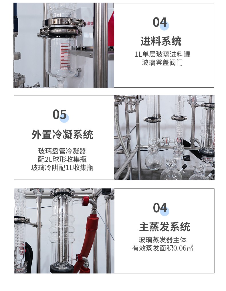 双级玻璃薄膜蒸发器,它的型号是 QYBM-80c,蒸发面积为0.1平方米,配了1L单层的进料罐,理论处理量是5-10L/H,处理量根据原料不同也会不同。
