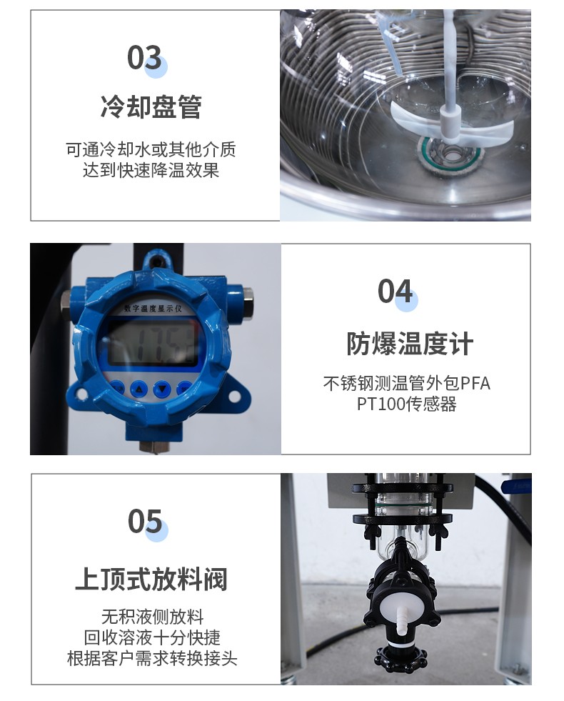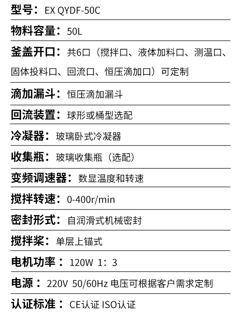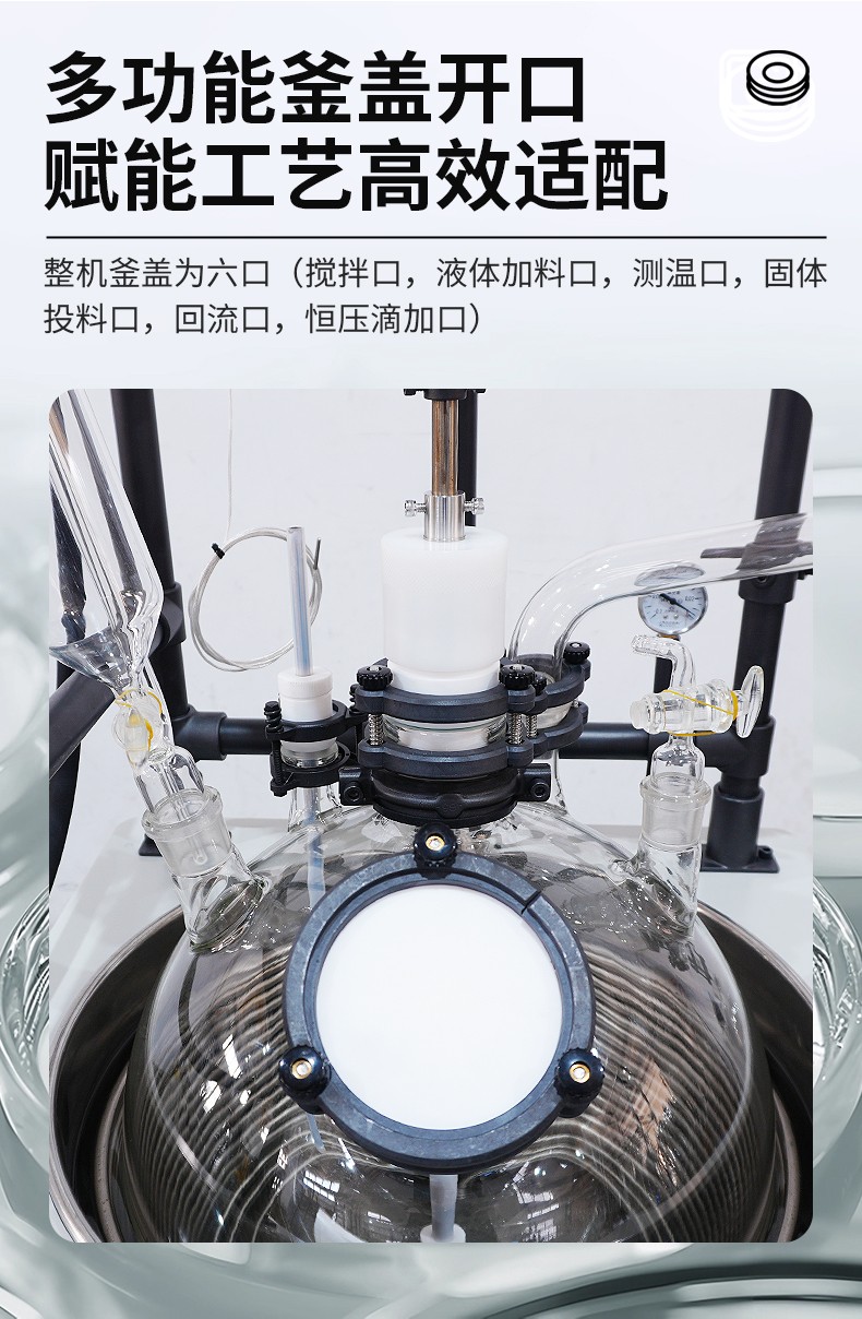 | 釜盖开口 | 共6口(搅拌口、液体加料口、测温口、固体投料口、回流口、恒压滴加口)可定制 | |||||||