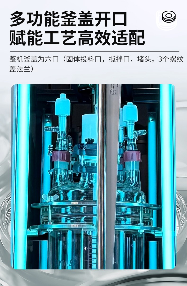 | 釜盖开口 | 共6口(搅拌口、液体加料口、测温口、固体投料口、回流口、恒压滴加口)可定制 | |||||||