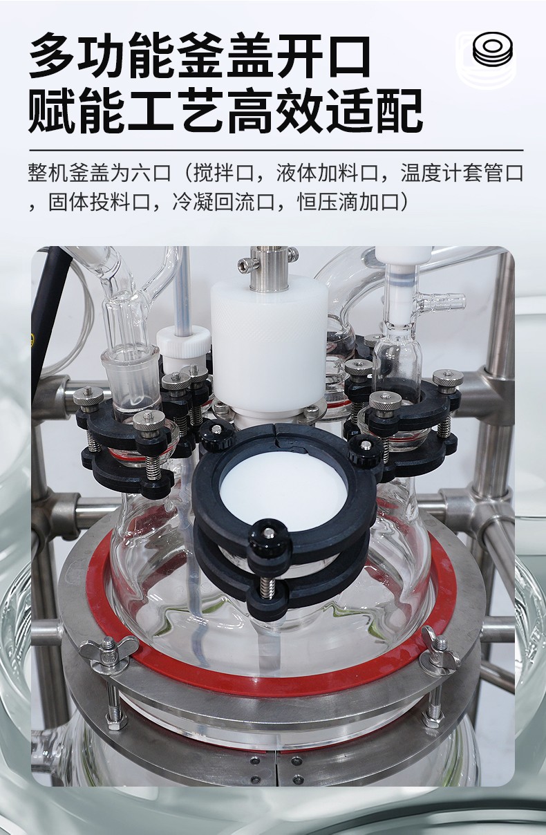 整机釜盖为六口(搅拌口,液体加料口,温度计套管口