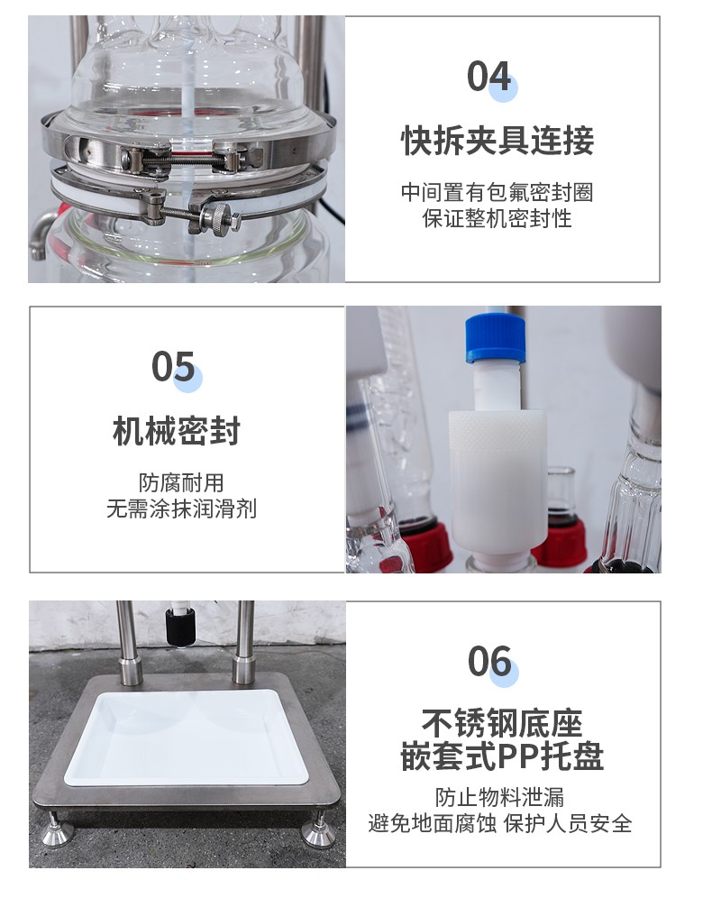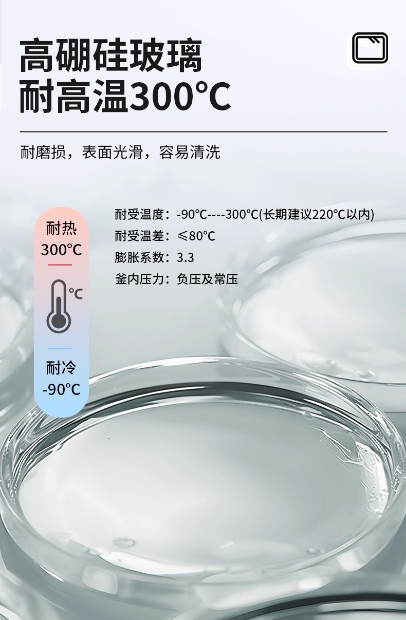| 釜体与釜盖 Kettle and cover | 快卡夹具连接,可以轻易拆卸,中间置有四氟骨架 Connected by quick-release clamps, it can be easily disassembled. There is a PTFE framework in the middle. | |||