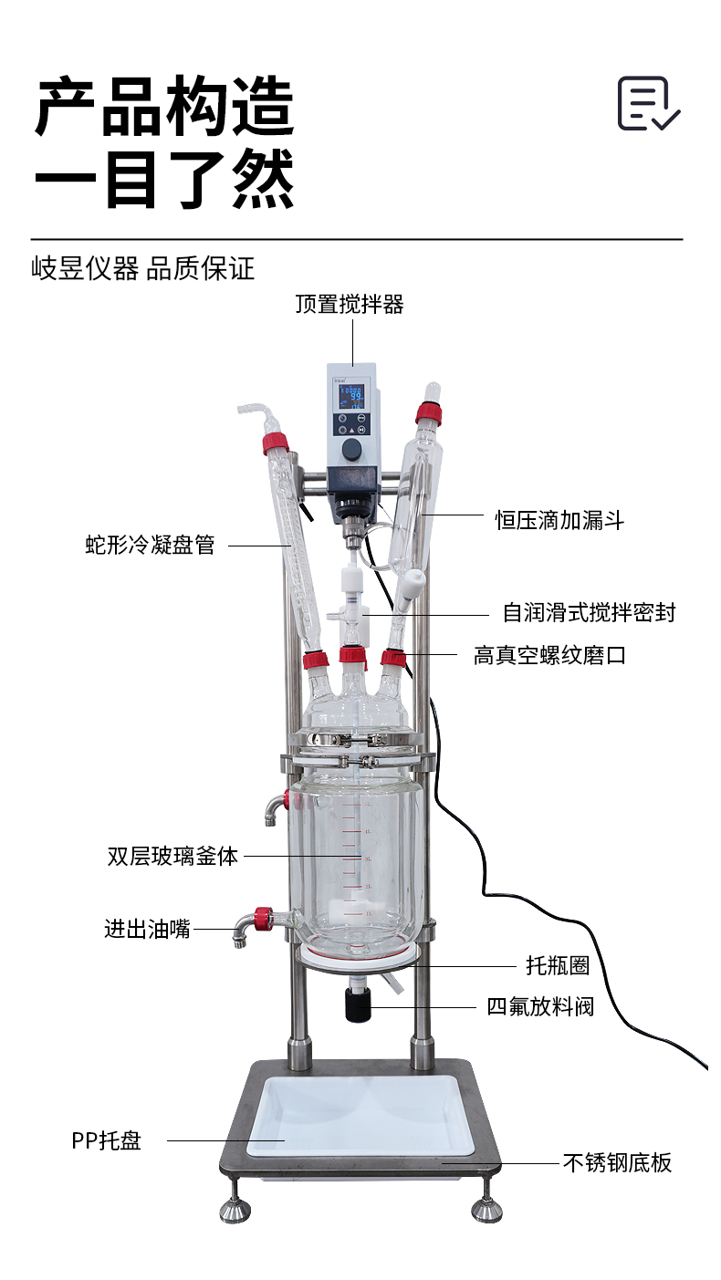 | 釜盖开口 Cover openings | 共5口(搅拌口 、恒压滴加口、测温口、进料口、冷凝口)可定制 A total of 5 (stirring port, constant pressure drop port, temperature measuring port, feed port,Condensation port ),can be customized | |||