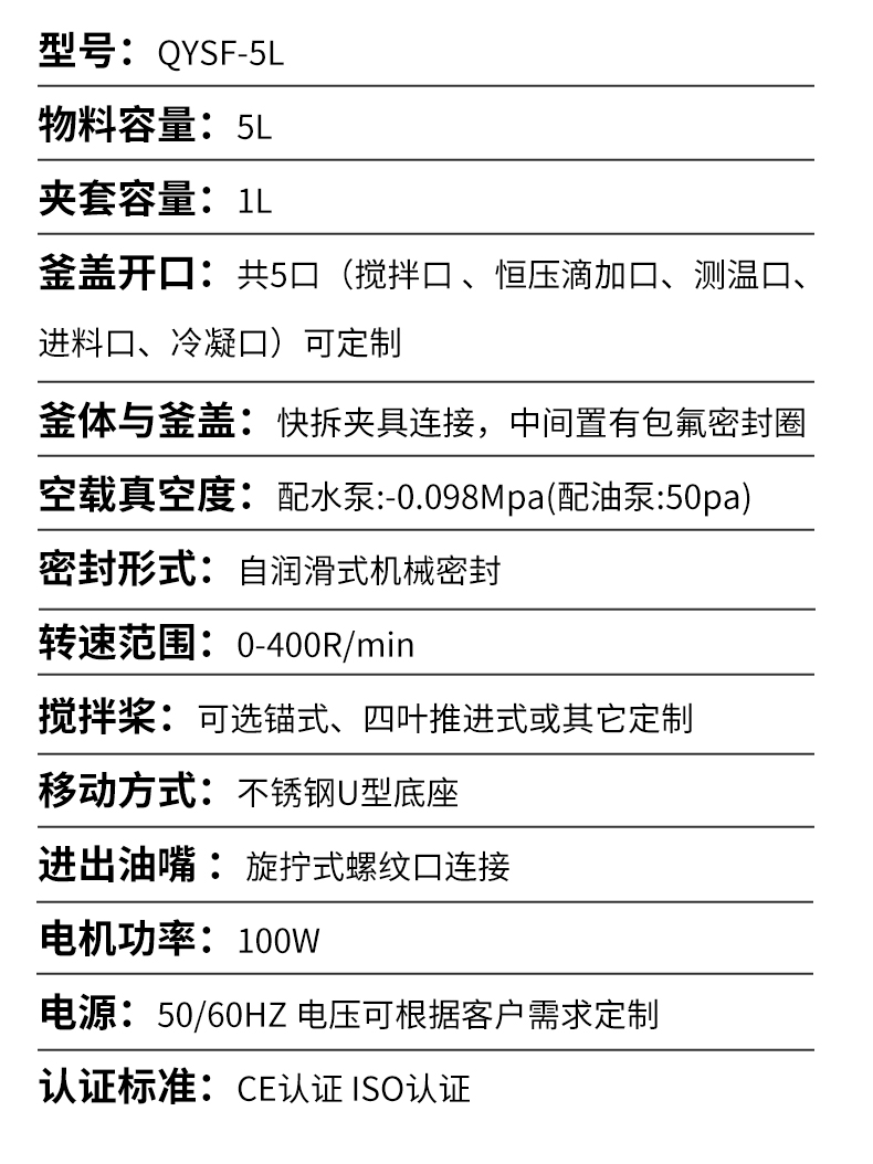 | 型号 MODEL | QYSF 500mL(X) | QYSF-1L(X) | QYSF-2L(X) | QYSF-5L(X) |