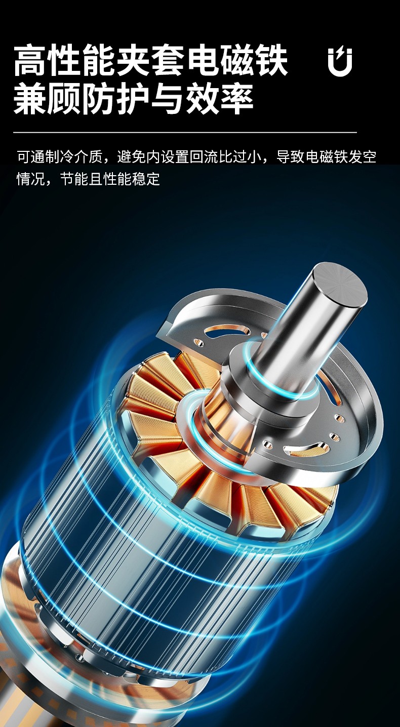 夹套电磁铁,可通冷却水,防止磁铁过热发生损坏,保证长期使用中的重复作业的安全
