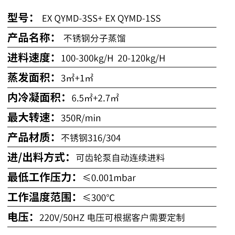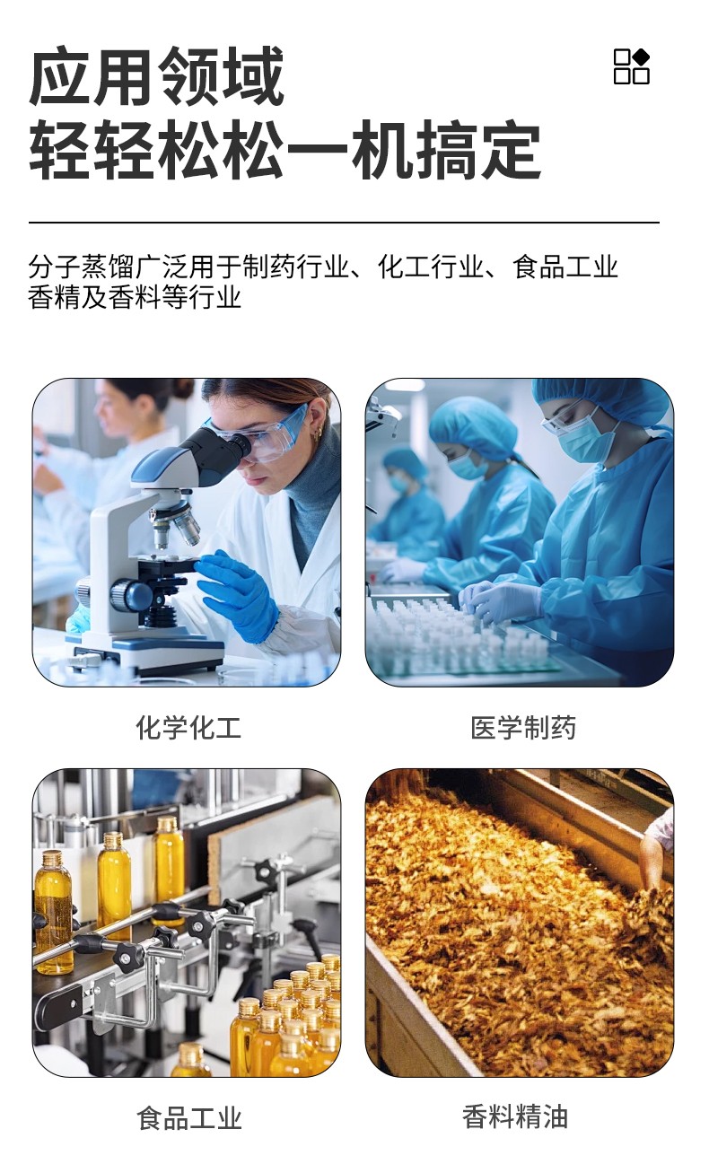 应用于:原料药、维生素的提纯;精油或者植物提取油的纯化处理:脱除硅油、树脂、聚合物中的单体:蒸馏单