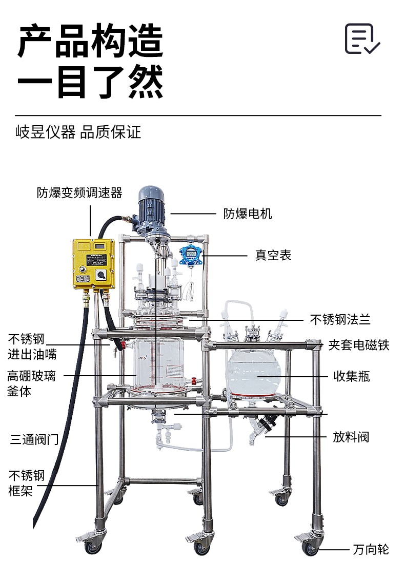 收集瓶与反应釜设计在一个框架上,使用人员可以在一个相对集中的区域内完成反应和物料收集等一系列工作,更安全高效。
