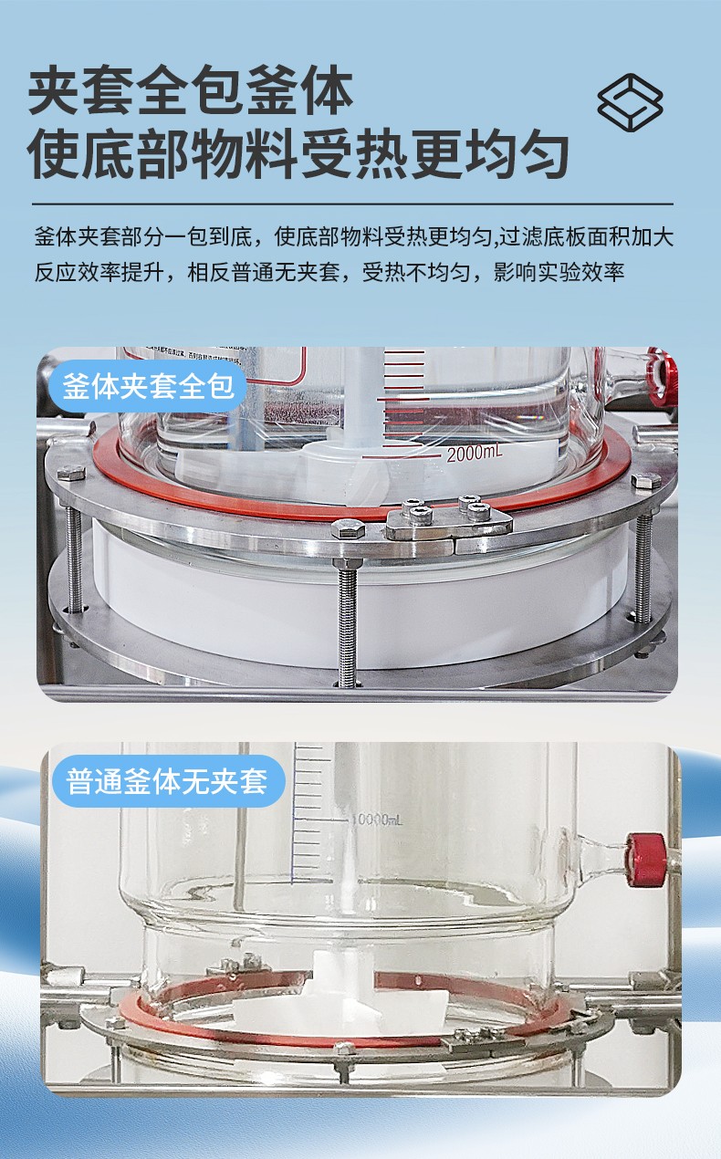 釜体夹套部分一包到底,使底部物料受热更均匀,过滤底板面积加大,反应效率提升。