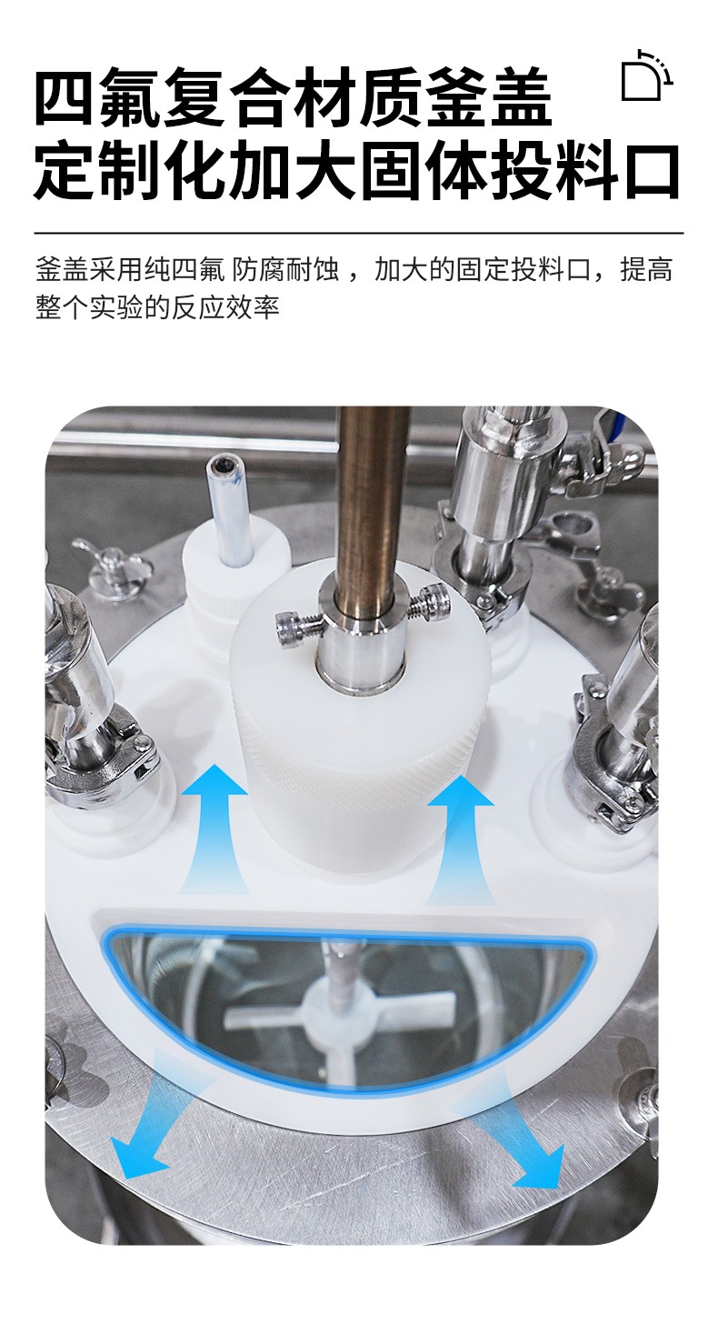 | 釜盖开口 Cover openings | 共6口( 搅拌口,液体进料口,测温口,固体投料口,放气口、备用口)可定制 A total of 6 ports (mixing port, liquid feed port, temperature measuring port, solid feed port, air vent, spare port), can be customized | |||||