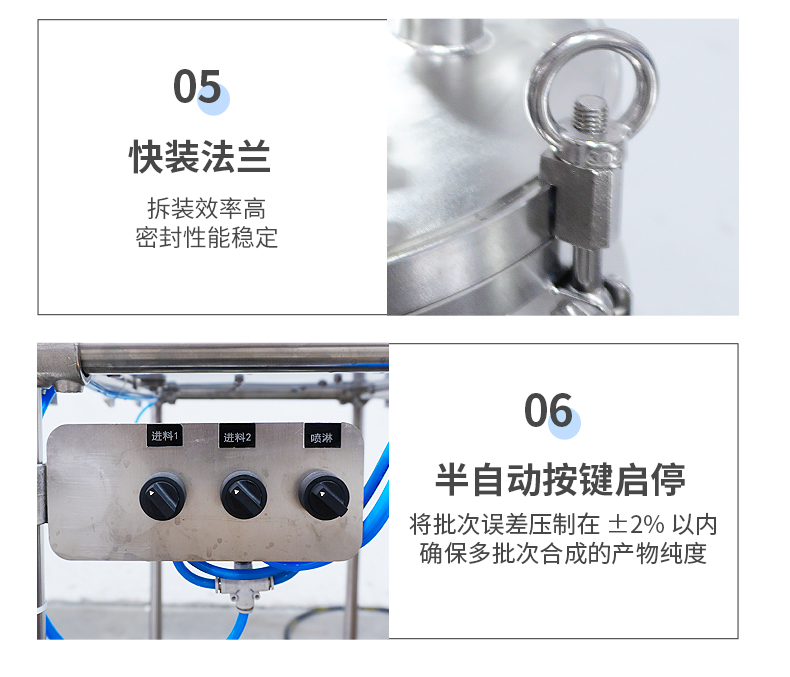 | 釜盖开口 | 共6口(视窗观察口、固体投料观察口、液体进料口,测温口,搅拌口,排气口)开口可根据客户需求定制 | |||||