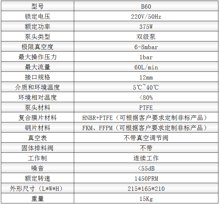 i 抗强化学腐蚀:耐腐蚀真空泵使用了特殊的隔膜(膜片表面符合PTFE涂层)和泵头设计,与气体接触的部分均为进口PTFE材料,