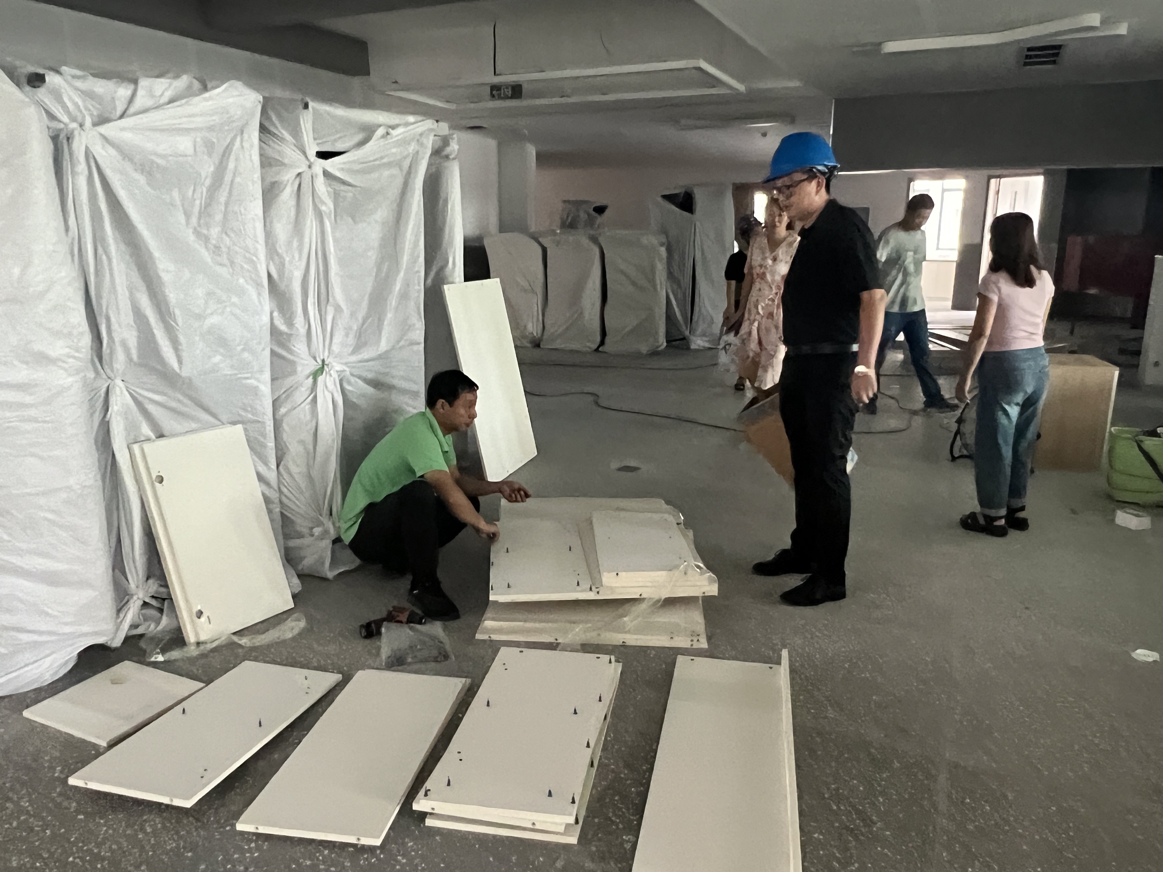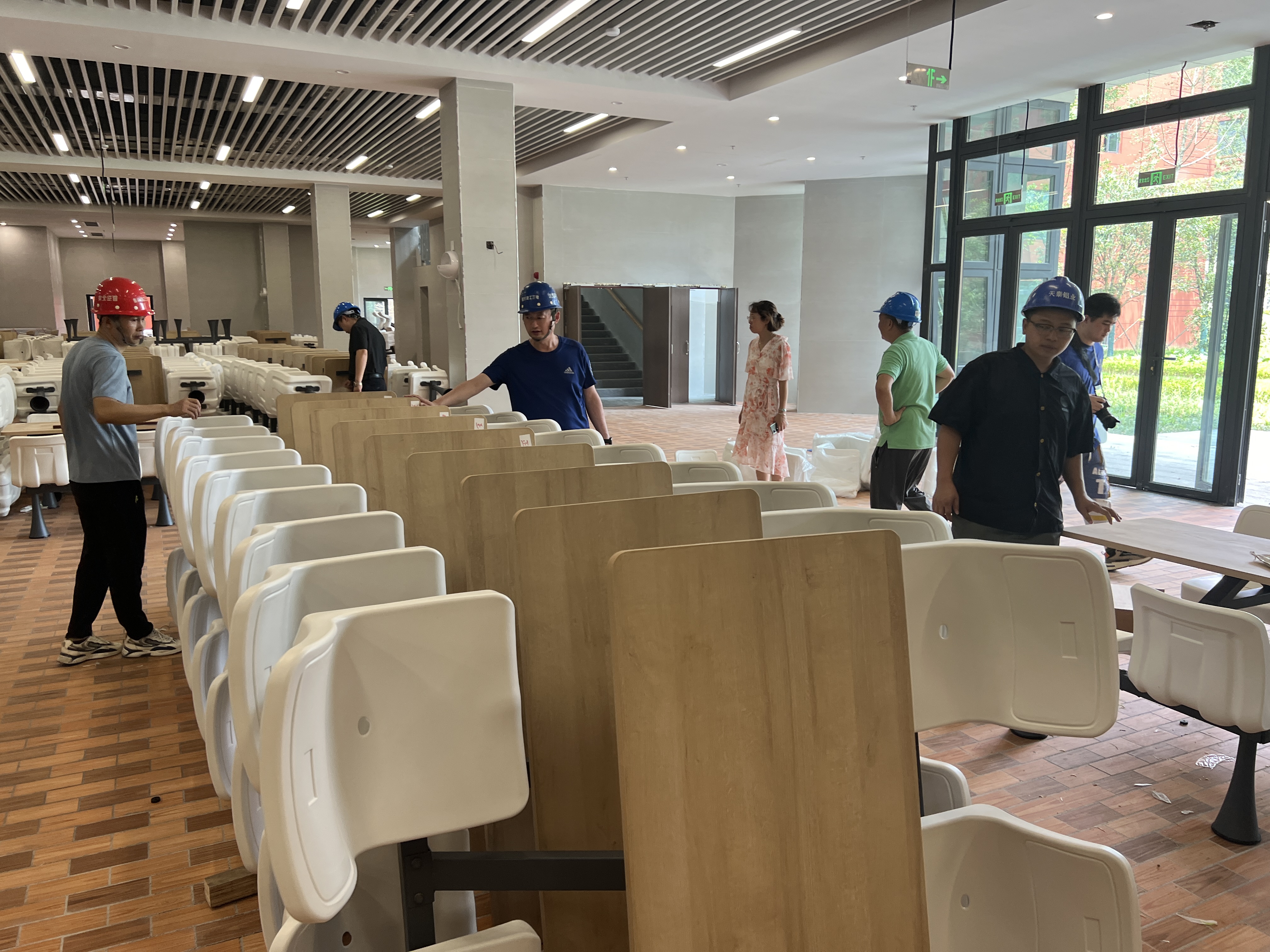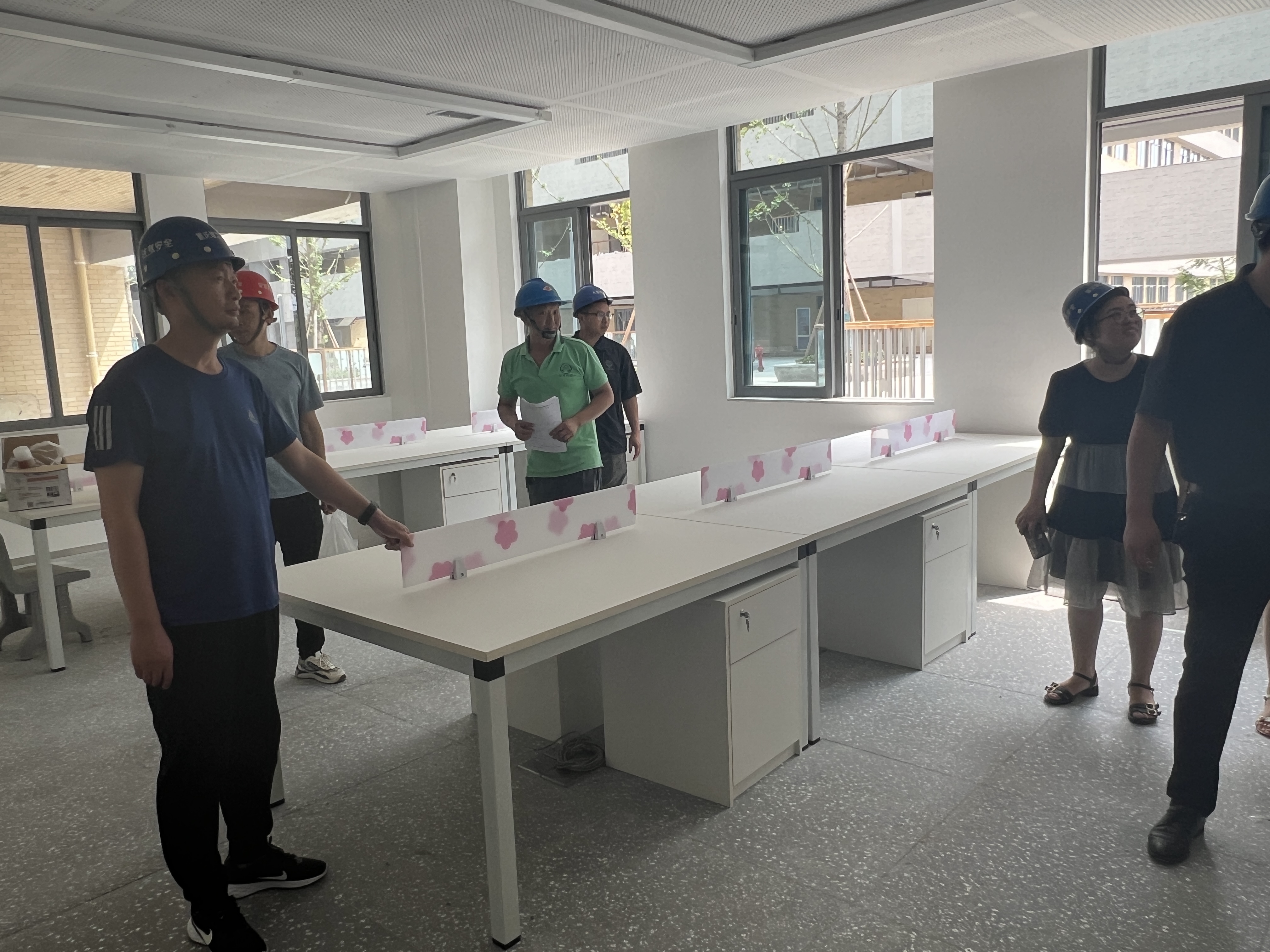 紧接着,一行人步行到已安装完工的育才中学,前后仔细检查了教室、食堂里所供的家具,整体都比较满意,对极少的瑕疵仍然要求立即整改到位。